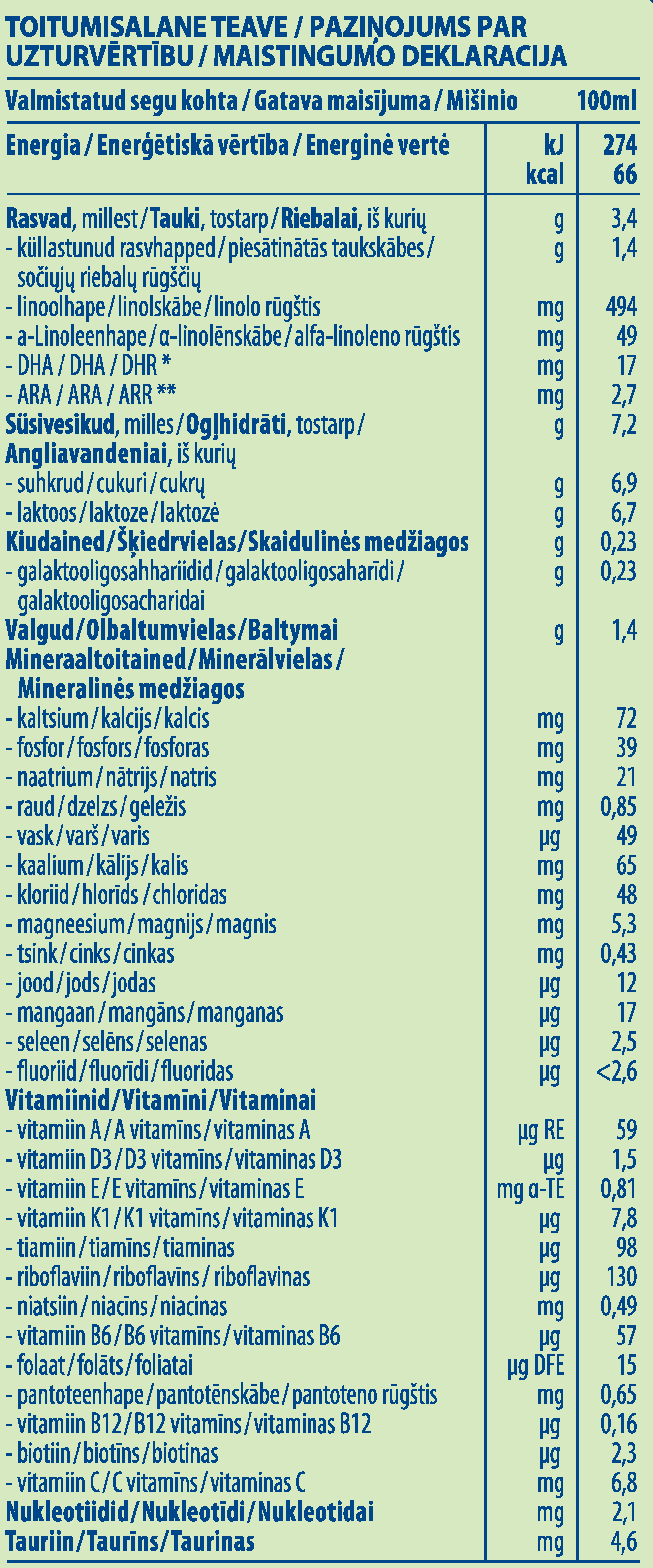 SASTĀVDAĻAS: Vājpiena pulveris, demineralizētu sūkalu pulveris (no piena), augu eļļas (palmu, palmu kodolu, rapšu (ar zemu erukskābes līmeni), saulespuķu), laktoze, galaktooligosaharīdi (no piena), maltodekstrīns, ortofosforskābes kalcija sāļi, zivju eļļa, kālija citrāts, kalcija karbonāts, nātrija hlorīds, citronskābes magnija sāļi, holīna hlorīds, kālija hlorīds, nātrija L-askorbāts, inozitols, taurīns, dzelzs sulfāts, Mortierella alpina eļļa, kalcija hidroksīds, emulgators (saulespuķu lecitīns), nukleotīdi (uridīna-5′-monofosfāts (UMF), citidīna-5′-monofosfāts (CMF), inozīna-5′-monofosfāts (IMF), adenozīna-5′-monofosfāts (AMF), guanozīna-5′-monofosfāts(GMF)), cinka sulfāts, L-askorbil-6-palmitāts, antioksidants (tokoferola ekstrakts), kalcija D-pantotenāts, DL-α-tokoferilacetāts, nikotīnamīds, vara sulfāts, tiamīna hidrohlorīds, riboflavīns, retinilacetāts, piridoksīna hidrohlorīds, mangāna sulfāts, folijskābe, kālija jodīds, fitomenadions, nātrija selenīts, D-biotīns, holekalciferols.
