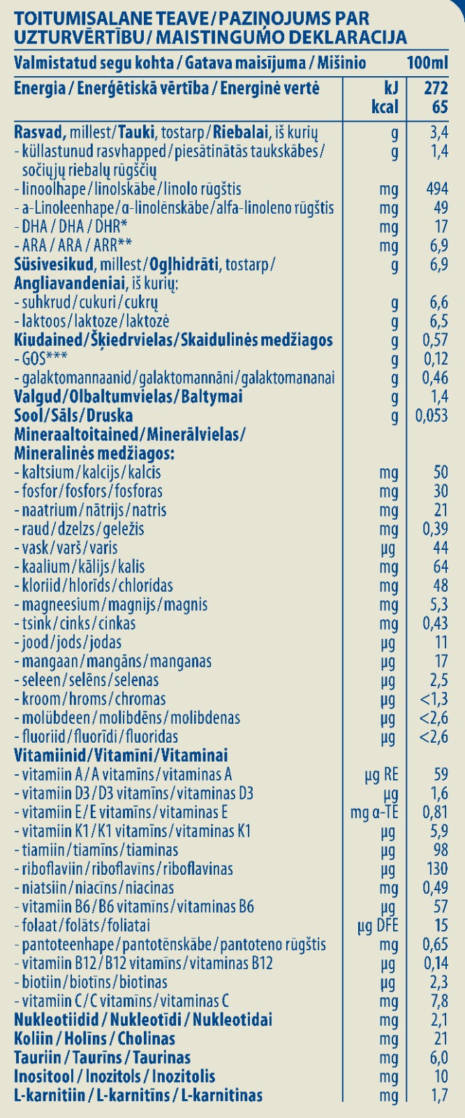 SASTĀVDAĻAS: vājpiena pulveris, demineralizētu sūkalu pulveris (no piena), augu eļļas (palmu, palmu kodolu, rapšu (ar zemu erukskābes līmeni), saulespuķu), laktoze, biezinātāji (ceratoniju augļu sveķi), galaktooligosaharīdi (no piena), maltodekstrīns, zivju eļļa, kālija citrāts, ortofosforskābes kalcija sāļi, kalcija karbonāts, nātrija hlorīds, citronskābes magnija sāļi, holīna hlorīds, Mortierella alpina eļļa, kālija hlorīds, nātrija L-askorbāts, inozitols, taurīns, kalcija hidroksīds, emulgators (saulespuķu lecitīns), nukleotīdi (uridīna-5′-monofosfāts (UMF), citidīna-5′-monofosfāts (CMF), inozīna-5′-monofosfāts (IMF), adenozīna-5′-monofosfāts (AMF), guanozīna-5′-monofosfāts (GMF)), dzelzs sulfāts, cinka sulfāts, L-askorbil-6-palmitāts, antioksidanti (tokoferola ekstrakts), kalcija D-pantotenāts, DL-α-tokoferilacetāts, nikotīnamīds, vara sulfāts, tiamīna hidrohlorīds, riboflavīns, retinilacetāts, piridoksīna hidrohlorīds, mangāna sulfāts, folijskābe, kālija jodīds, fitomenadions, nātrija selenīts, D-biotīns, holekalciferols.