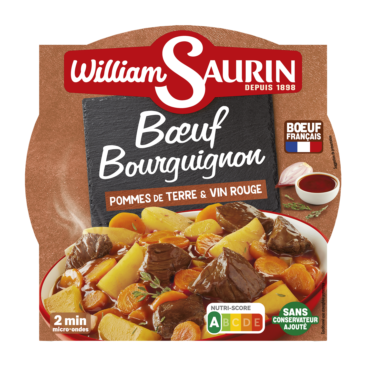 Sastāvdaļas: Iepriekš pagatavoti kartupeļi: 28 %, iepriekš pagatavota liellopu gaļa sālījumā: 25 % (liellopu gaļa, sālsūdens, skābuma regulētājs: nātrija citrāts), ūdens, burkāni: 16 %, sarkanvīns: 5 %, tomātu koncentrāts, sīpoli, modificēta ciete, aromātiski augi (tostarp šalotes sīpoli un timiāns), sarkanvīna ekstrakts, rapšu eļļa, dabiski aromatizētāji, kakao pulveris, garšvielas. Gaļas izcelsmes valsts: Francija.