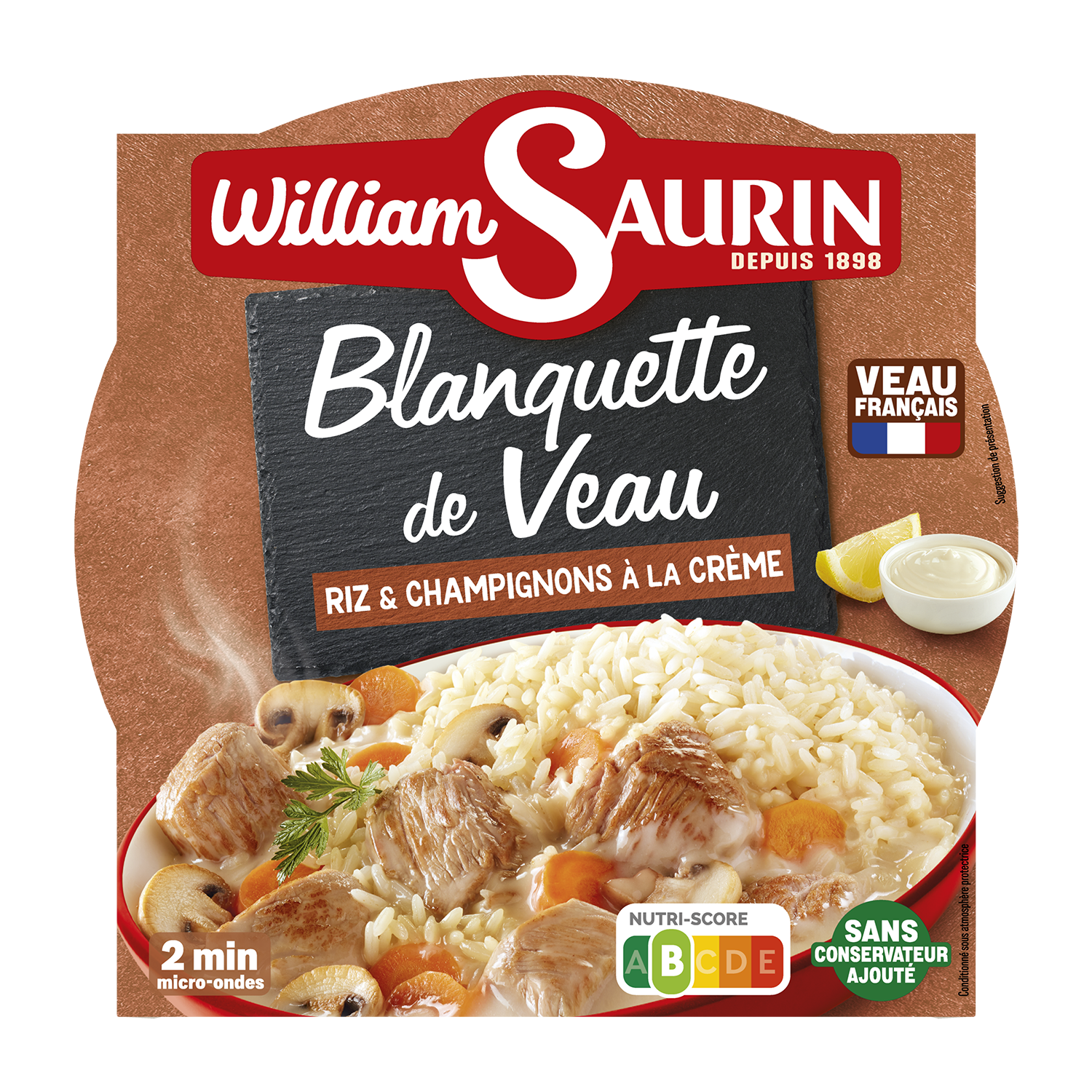 Sastāvdaļas: Iepriekš pagatavoti rīsi: 37 %, iepriekš pagatavota teļa gaļa sālījumā: 27 % (teļa gaļa, ūdens, sāls, skābuma regulētājs: nātrija citrāts), ūdens, SALDAIS KRĒJUMS: 4,8 %, burkāni: 4 %, dārza atmatenes: 3,4 %, modificēta ciete, rapšu eļļa, sīpoli, dabiski aromatizētāji, sāls, biezinātāji: guāra sveķi un ksantāna sveķi, baltvīns, PIENA olbaltumvielas, koncentrēta citronu sula: 0,03 %. Gaļas izcelsmes valsts: Francija.